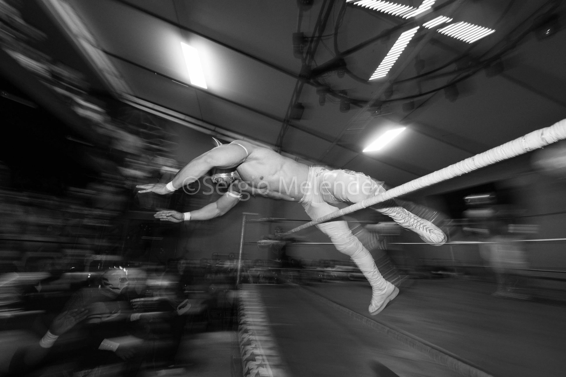 The frozen motion reveals the essence of Mexican lucha libre: an art born from the people, where every flight is an act of resistance and beauty.